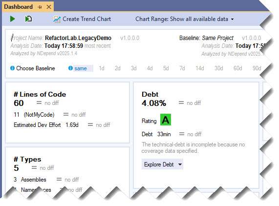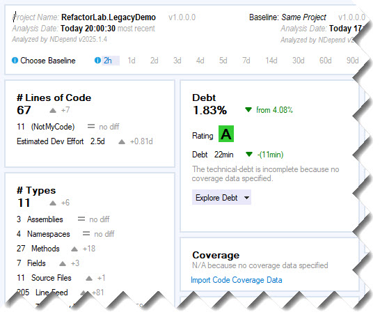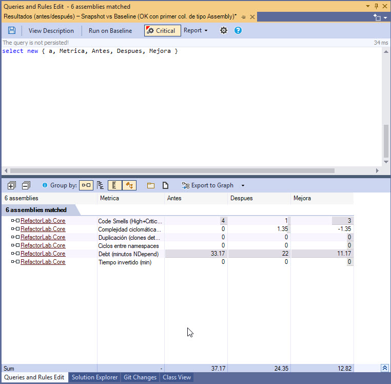 - Deuda técnica (minutos): de 33.17 a 22 (−11.17). Menos deuda ⇒ menos esfuerzo pendiente. En NDepend, menos deuda es mejor.