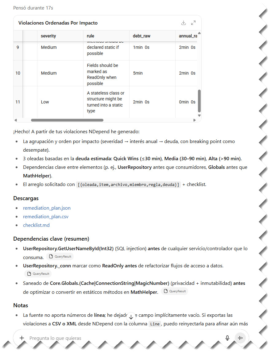 NDepend me dio el foco (qué arreglar primero y por qué), y la IA me dio tracción (cómo arreglarlo, con diffs y tests). En una tarde cerré casi la mitad de la deuda prioritaria y eliminé ciclos de dependencias.