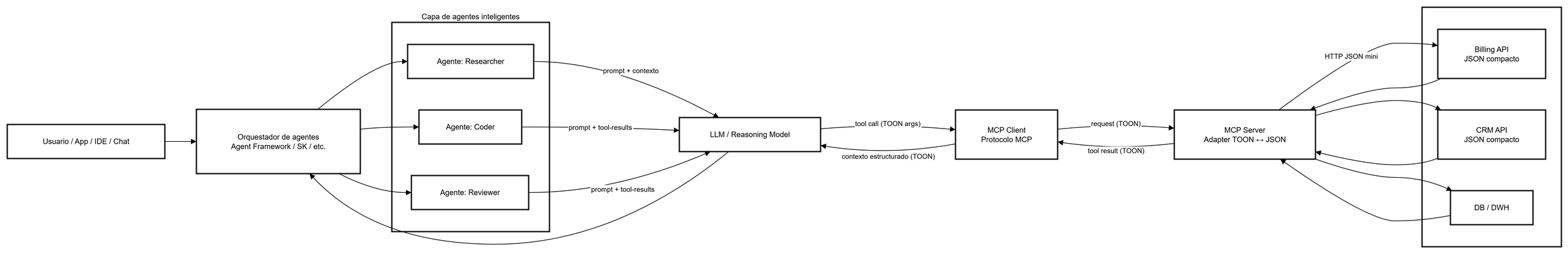 MCP Server ↔ agentes / LLM → TOON (compacto, estable, menos tokens)